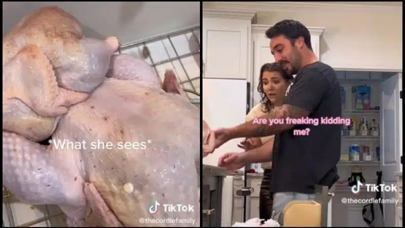 Στο βίντεο που ανέβασε στο TikTok, ο Χάντερ κάνει στην κουζίνα τις προετοιμασίες και μαζί με την τεράστια γαλοπούλα έχει και ένα μικρό κοτόπουλο. Τότε φώναξε την σύζυγό του Ντέβιν και της είπε: «Δεν πρόκειται να το πιστέψεις, αλλά έλα να δεις τι έβγαλα μέσα από την τεράστια αυτή γαλοπούλα!».