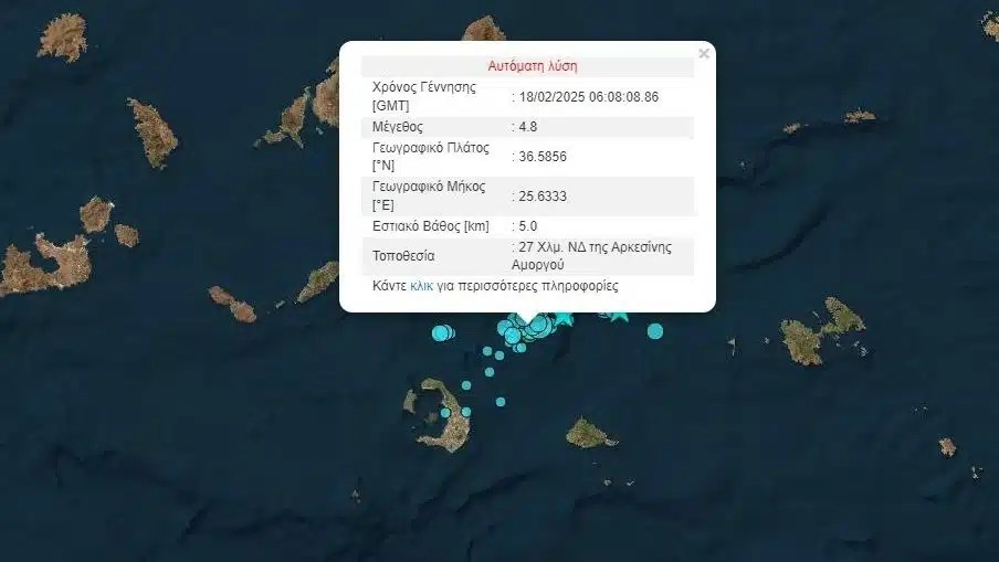 Νέα σεισμική δόνηση καταγράφηκε στη θαλάσσια περιοχή κοντά στην Αμοργό, με το εστιακό βάθος να εκτιμάται στα 13,6 χιλιόμετρα. Το επίκεντρο του σεισμού εντοπίζεται περίπου 17 χιλιόμετρα νότια-νοτιοανατολικά της Αρκεσίνης Αμοργού.
